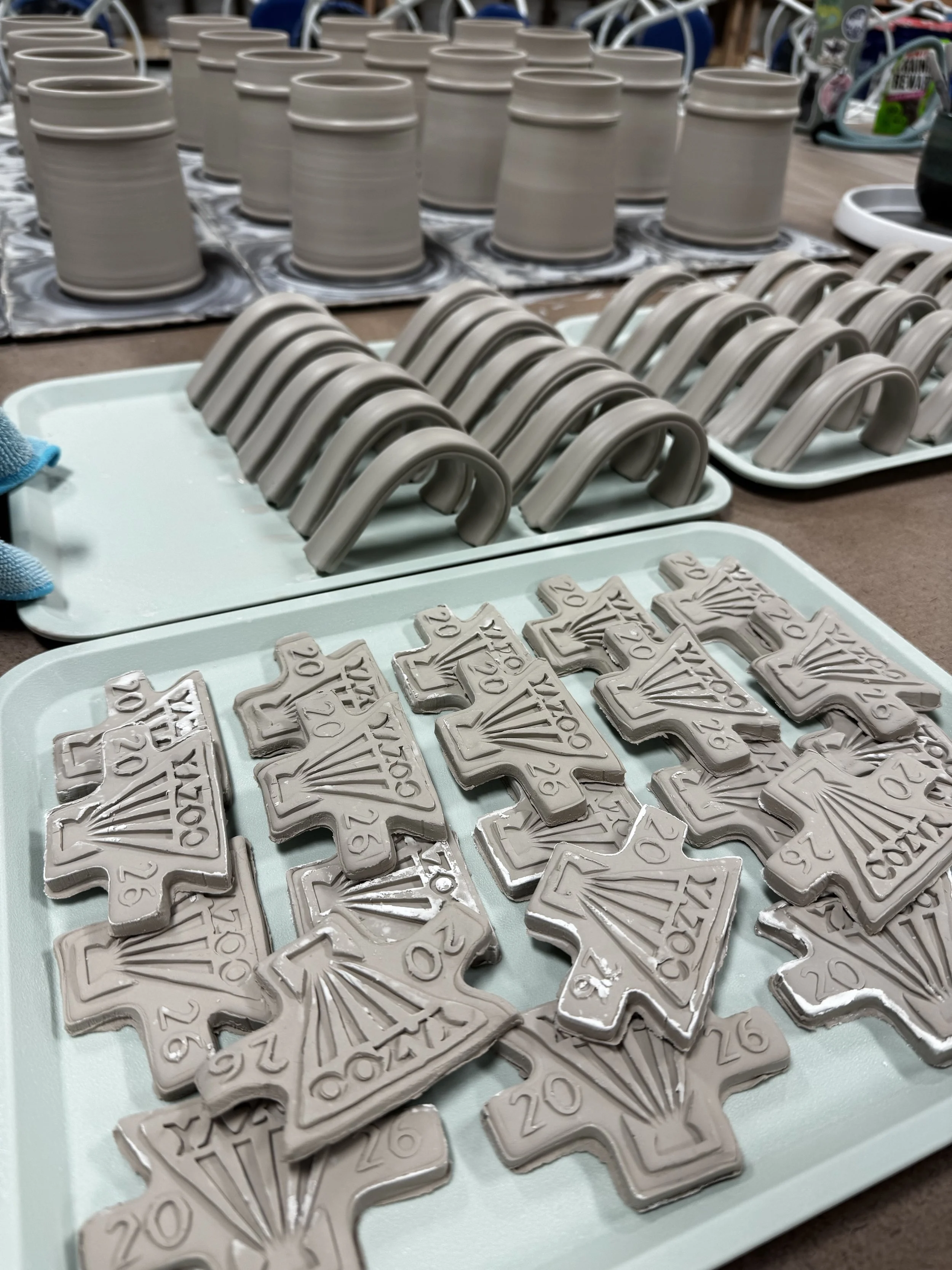 2026 was our third year making the Yazoo Mug Club mugs. We deliver 160 20oz mugs in January. Each year we make a custom stamp and work with the team at Yazoo to select the perfect custom glaze. This year the selected glaze was a combination of a custom red and a tenmoku.