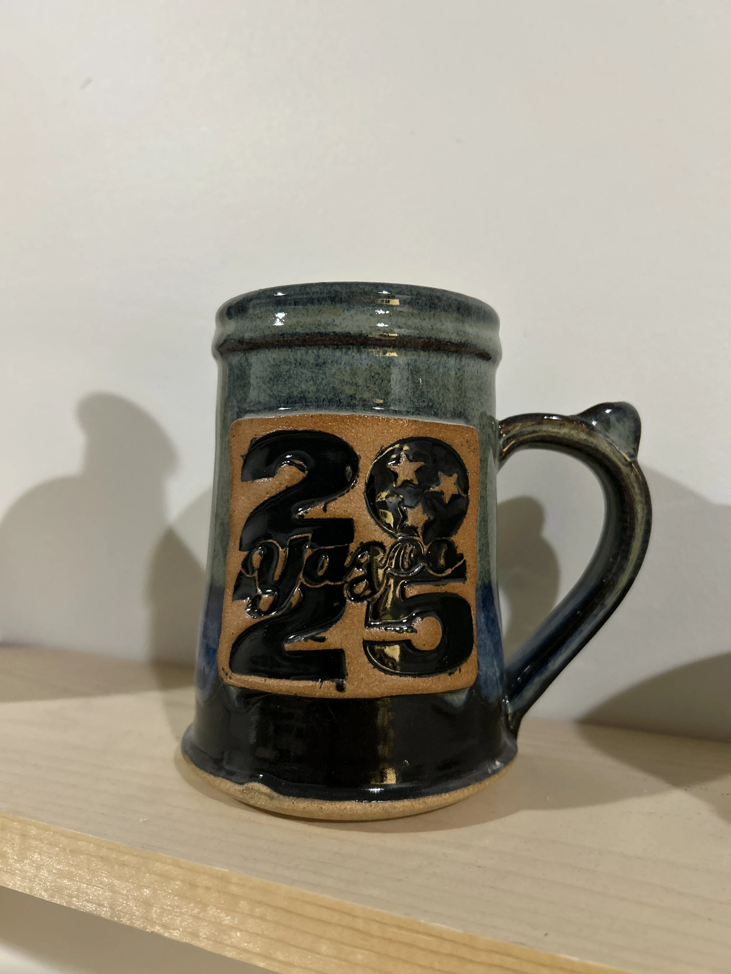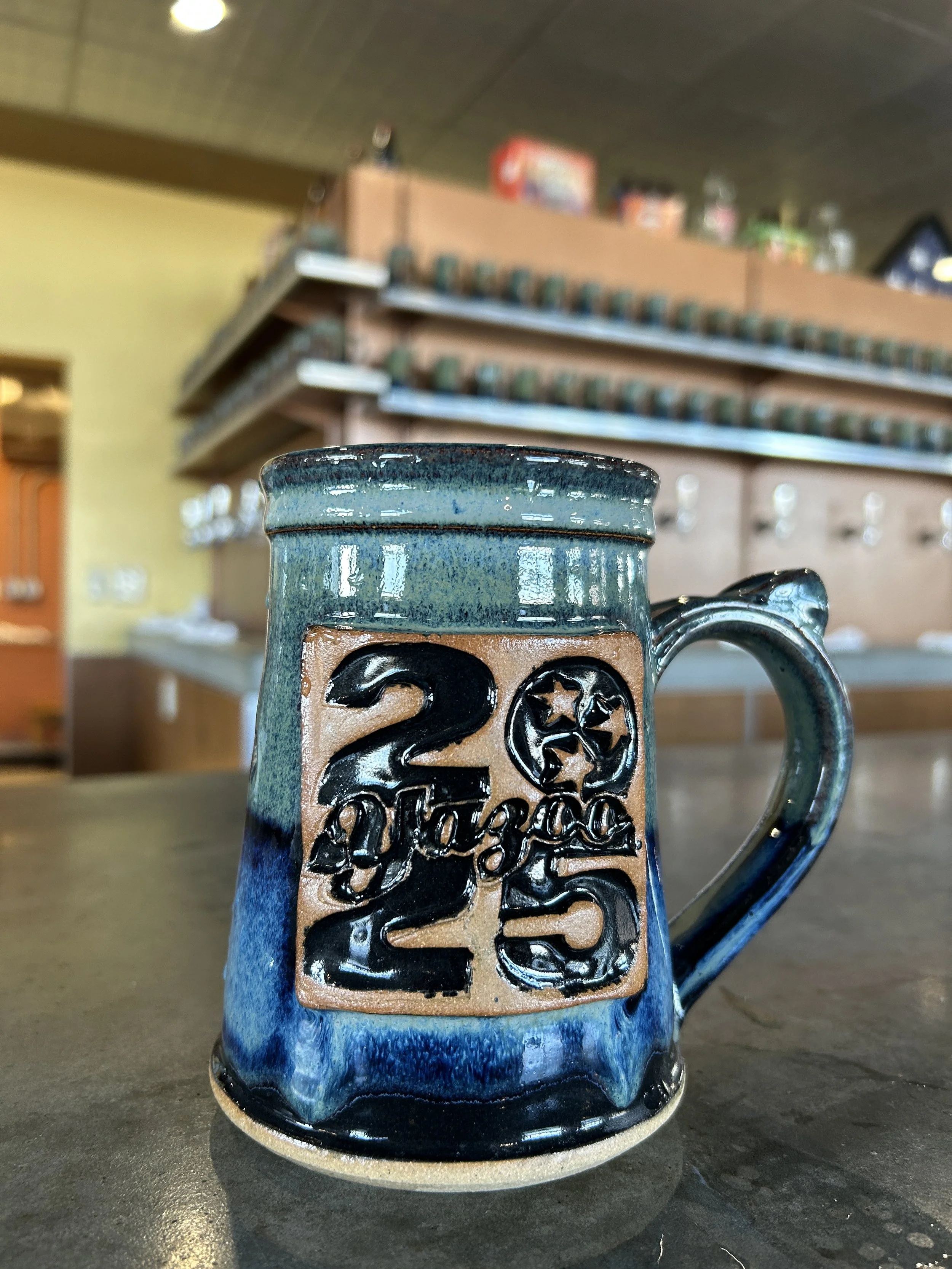 2025 was our second year making the Yazoo Mug Club mugs. We deliver 160 20oz mugs in January. Each year we make a custom stamp and work with the team at Yazoo to select the perfect custom glaze.
